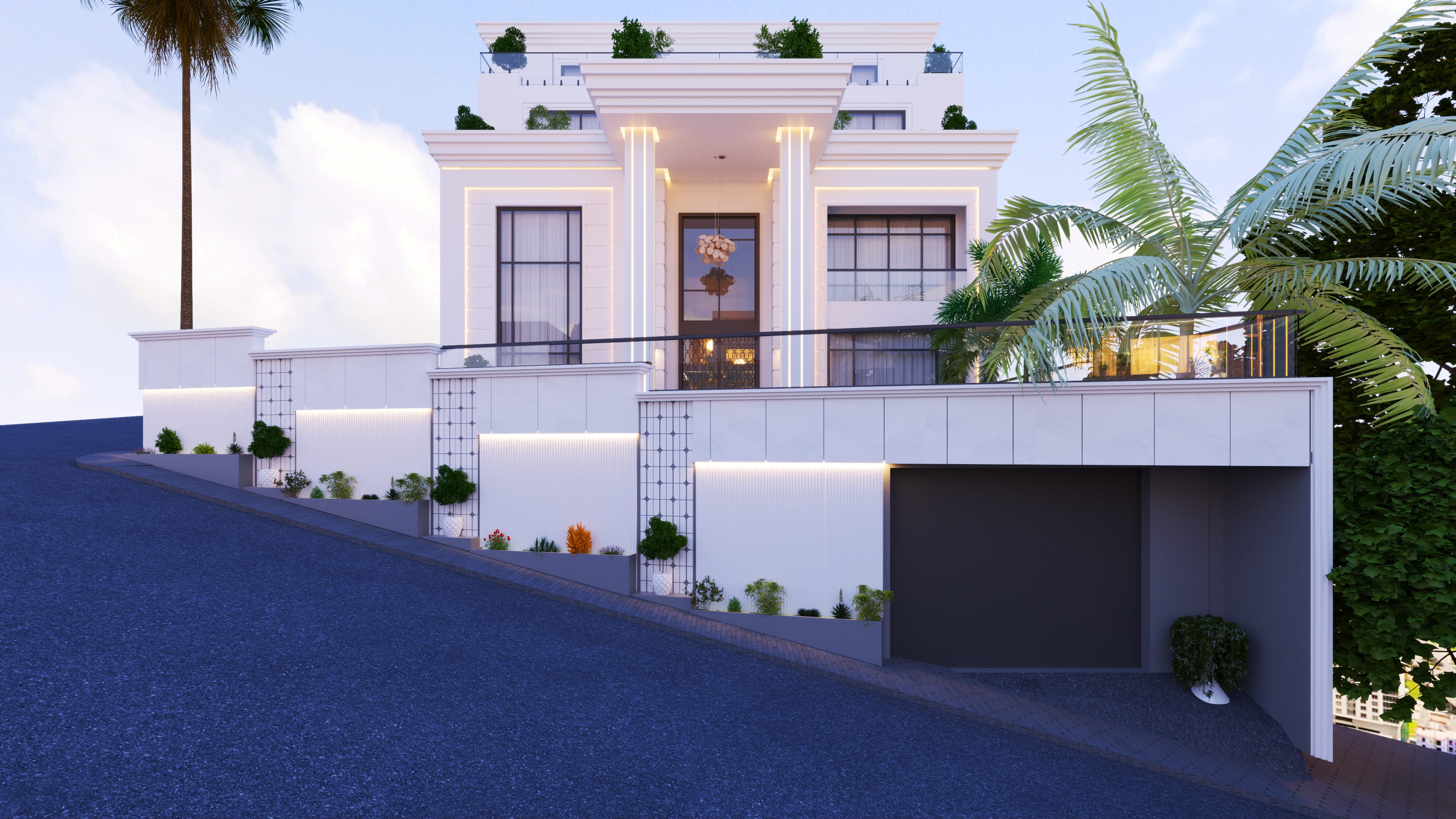 Architectural Innovation: A grand Classical-style facade characterized by elegant light-linear accents, integrated terrace greenery, and strategically optimized openings to flood the interior with natural light.